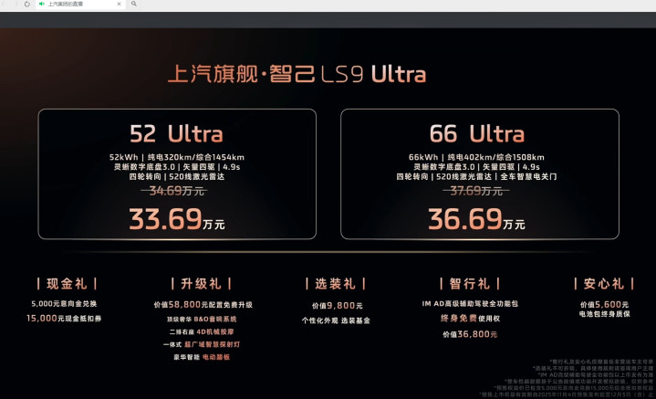 值得一提的是,两个配置命名均为Ultra版,从已知信息来看,除了电池的不同所带来纯电续航、综合续航里程的不同之外,其他重点核心配置基本都是相同的(66版本比52版本多一项全车智慧电关门)。而这一次,智己为LS9两个版本准备了“武装到牙齿”的标配,包括但不仅限于: